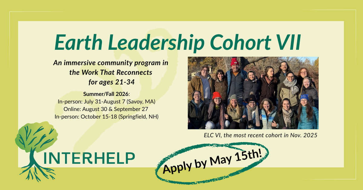 October 15-18 (Springfield, NH)For the final meeting of ELC VII, cohort members will meet in person from the evening of October 15 through the afternoon of October in a retreat just for the cohort. On Friday evening (October 16), the cohort will then join a larger intergenerational Work That Reconnects weekend workshop–The Dharma of Interconnection–facilitated by Deborah Eden Tull. Every ELC program has included an opportunity for the cohort to join a larger intergenerational Work That Reconnects workshop. This offers a special opportunity to experience highly skilled Work That Reconnects facilitation blended with complementary modalities.
